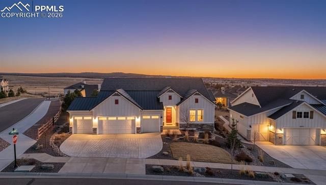 Perched at the top of the hill, this award winning ranch plan captures sweeping Pikes Peak & Front Range views from a premium homesite with a rare flat backyard, ideal for both play & entertaining. Former builder model blends farmhouse architecture w/ elevated designer finishes throughout. Main level showcases a dramatic great room with 12’ ceilings, wood beams, designer lighting, & a fireplace w/ designer tile. Expansive 12’ sliding glass doors flood the home with natural light & open to a large covered deck w/ a gas line for indoor-outdoor living. The high-end gourmet kitchen is built to impress, featuring slab granite counters, oversized subway tile backsplash, modern stainless steel hood, generous island, crown-molded cabinetry, & a walk-in pantry. The main-level primary suite is a true retreat with tray ceilings, designer wallpaper, high-end carpet, & motorized Hunter Douglas blackout blinds. The spa-inspired 5-piece bath showcases herringbone tile, a huge walk-in shower, quartz double vanity, freestanding modern soaking tub, & a large walk-in closet. Downstairs, the finished basement is designed for entertaining with a spacious rec room, contemporary fireplace, & gorgeous wet bar. Three additional bedrooms—all with walk-in closets, provide flexibility, w/ the largest featuring a private bath ideal for guests. One basement bedroom and a rec room window include blackout blinds, creating an ideal future media room setup. Hunter Douglas blinds installed throughout, w/ motorized controls in the primary suite, great room windows & doors, & dining area, operable by remote or smartphone app. Additional upgrades include custom window panes in the wall cut outs, Racedeck garage flooring in the 4-car garage, EV Charger, upgraded Arhaus entry & stair chandeliers, blown-in insulation package, wood shelving, smart home features, central A/C, & concrete tile roof. Designer finishes, open layout, premium technology, & iconic Colorado views, this is Flying Horse at its best.