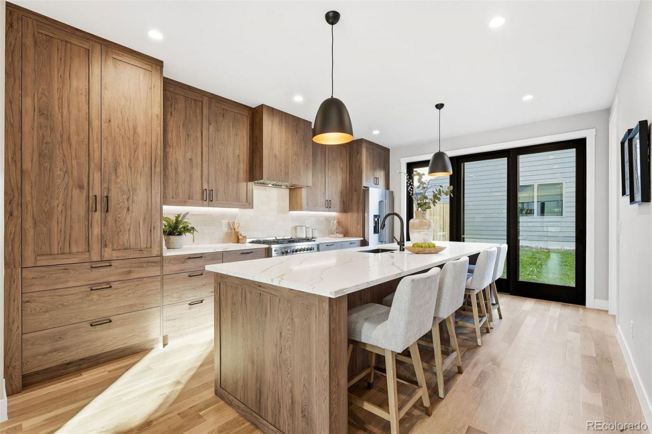 Modern Duplex with Stunning Mountain Views in vibrant Platt Park/Rosedale neighborhood. Meticulously crafted modern duplex, designed with both style and sustainability in mind. Just steps away from the heart of South Broadway and Pearl Street, known for its eclectic mix of boutiques, restaurants, and parks. A perfect blend of cutting-edge design and eco-conscious features that prioritize energy efficiency and sustainability. Main floor features a bright and airy open concept, highlighted by soaring 9-foot ceilings and sliding glass doors that flood the space with natural light. Gourmet kitchen, with a large island, is a chefs dream, equipped with quartz counters, high-end tile, pendant lighting, and stainless steel appliances. Living room boasts an open concept floorplan with seamless transition to the private back patio extending your living space outdoors. Dining room is spacious and offers the ideal entertaining floor plan. Every inch of this home is thoughtfully designed, with custom stained hardwood floors, sophisticated tile selections, and modern lighting that add character and warmth. Primary suite is a luxurious retreat, featuring an oversized walk-in closet, double vanity, and a spacious shower and freestanding soaker tub. Two additional bedrooms and a full bath, along with a conveniently located walk-in laundry room, complete the second floor. Third floor is the perfect space to unwind, featuring a sitting room, wet bar, 4th Bedroom or office, a full bath, and an incredible rooftop deck with views of the mountains. The versatile bonus room can be tailored to your needs?whether you want a home office, gym, or private place to watch TV or read a book. There is no shortage of space for all your belongings with a two-car garage with 8 doors for easy access for you snowboards/skis or Thule racks. Prime location with a mountain view.