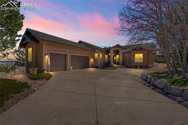 Set in the prestigious Mahogany Vale at Peregrine, this Symphony Homes custom ranch offers 5 bedrooms, 4 full baths, and main level living on a private 0.79 acre cul-de-sac with sweeping mountain, valley, meadow, and city views. Backing to open space, the home captures natural scenery from nearly every window, including the walk-out basement. Features include a transferable Class 4 roof warranty, paid-off solar, and completed fire mitigation. The main level includes the primary suite, an additional bedroom and full bathroom, office, and laundry. New hickory hardwood flooring spans the main living areas, complemented by new carpet, upgraded lighting, and dimmer switches throughout. The kitchen features Taj Mahal marble countertops and backsplash, refreshed cabinetry, Bosch double ovens, new sink and faucet, and access to the expansive deck. A breakfast nook is positioned to take in the views, while the formal dining room opens to the living room, ideal for entertaining. The living room showcases a refreshed fireplace with reconditioned stone and mantel. The primary suite offers private deck access and a remodeled 5-piece bath with leathered granite, marble tile shower with glass enclosure, redesigned tub surround, and elevated finishes, all enhanced by stunning views from the soaking tub. The additional main level bathroom is fully updated with marble shower walls and flooring, glass enclosure, Taj Mahal marble surfaces, updated fixtures, and a new toilet. The walk-out lower level includes a remodeled bathroom and access to outdoor living. Outdoor spaces feature extended wraparound decking, low-maintenance artificial turf in front, and natural landscaping with pine and oak, stonework, fencing, propane fire pit, and firewood storage. Additional upgrades include window film, humidifier, hot water circulation system, garage doors, overhead storage, and consistent system maintenance. Located near Blodget Peak with access to trails, open space, and parks.