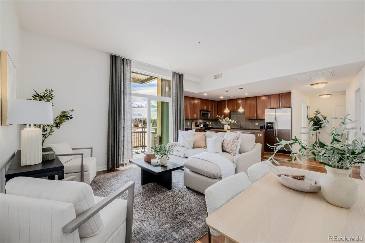This thoughtfully updated condo in Hangar Lofts offers the perfect blend of modern design, comfort, and urban accessibility. From the moment you step inside, the scale and natural light stand out. Soaring 10-foot ceilings and oversized windows create an airy, loft-like feel, while the open floor plan allows each space to flow seamlessly into the next. Fresh interior paint and brand new carpet give the home a clean, move-in-ready finish, complemented by rich hardwood flooring that anchors the main living areas with warmth and style. The kitchen is designed for both connection and function. Expansive granite countertops provide plenty of prep space, and the oversized center island with seating naturally becomes the gathering place for casual meals or entertaining friends. The kitchen opens directly into the living and dining areas, making the entire space feel cohesive and welcoming. Natural light pours into the living room, which extends effortlessly to a private, south-facing balcony. Unlike many condo communities, this balcony enjoys rare separation from neighboring units, offering a quiet and secluded outdoor space. A spacious guest bedroom includes a walk-in closet and convenient access to a 3/4 bath, making it ideal for guests, a roommate, or a home office setup. The primary suite is complete with a luxurious five-piece bath featuring an oversized soaking tub, separate shower, and ample storage. Location is where this home truly shines. Close by youll find Lowry Beer Garden, along with an expanding collection of neighborhood restaurants, shops, fitness options, daily conveniences and Town Center amenities, all within easy reach. Attractions like Wings Over the Rockies are minutes away, while quick access to Cherry Creek and downtown Denver keeps commuting and entertainment effortless. This home offers generous scale, thoughtful updates and a location that supports an active, connected lifestyle, all within one of Denvers most desirable communities.